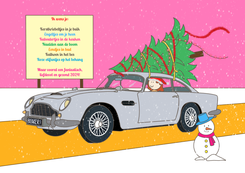 Bovendien had ik haar al eens getekend in een Aston Martin voor haar banner op LinkedIn. Deze twee kwamen dit jaar fraai bij elkaar in een nieuwe kerstkaart. Voorwaarde was wel dat er genoeg roze in mocht.