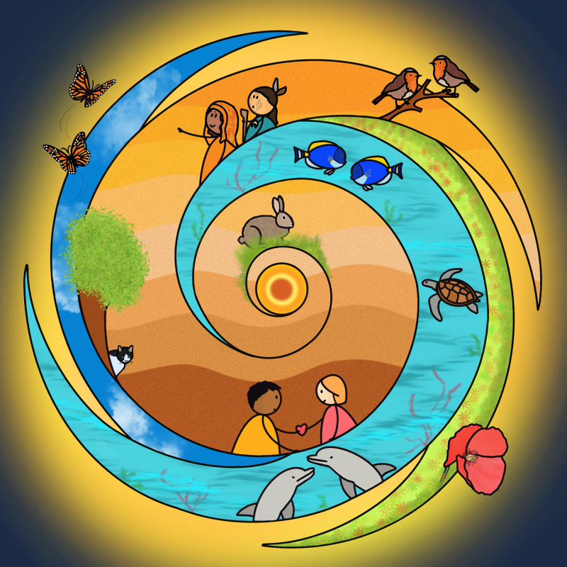 Diny van den Bout had een droom. Daarin kwamen een aantal dingen naar voren. Het geheel was voor haar net niet helemaal grijpbaar. Door met elkaar te verbinden en de intuïtie te laten stromen ontstond deze draaikolk. Alle elementen komen terug in deze cirkel van verbinding: aarde, water, lucht en vuur.