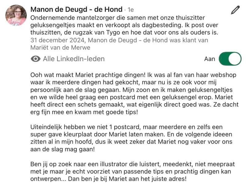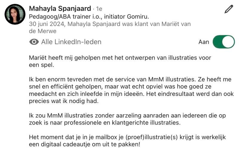 Zoals je hebt gezien maak ik zelf veel producten. Ik werk ook in opdracht. De opdrachten variëren van illustraties voor een boek tot aan banners voor LinkedIn. Van kleurplaat tot visual. Er is zoveel wat vraagt om visuele ondersteuning. Heb je een vraag over de mogelijkheden? Mail gerust: mmm.illustraties@gmail.com